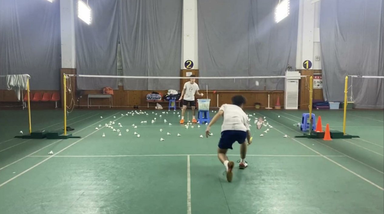 邹师思老师指导的羽毛球队在训练中