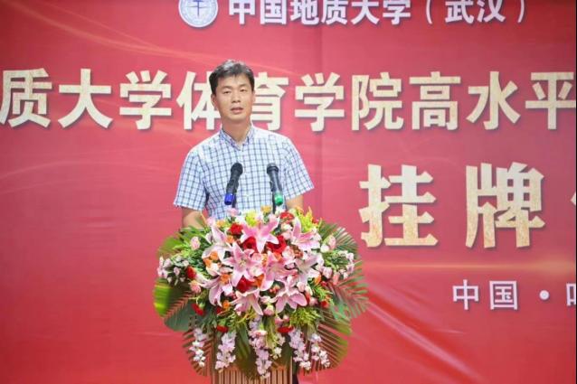 郎总首先对到来的一行领导表示热烈欢迎,并介绍了体育人俱乐部的建设与主要成果和特色体育的基本情况。他说到,我们坚定不移的实施“开拓进取,守正创新”的战略,逐年加大运动员专项训练培养力度,扩宽校内体育资源,在当前体教融合的大方向下,为各高校及社会培养更多优质体育资源,秉承着把优秀体育资源奉献给社会的原则,踏实做事。中国地质大学英国上市公司官网365田径项目高水平运动队训练基地的挂牌,意味体育人俱乐部在合作创新上又是一个新台阶。体育人俱乐部将发扬“地大精神、育人传承”的八字方针,与地质大学英国上市公司官网365共同联手,再创竞技水平新纪元。