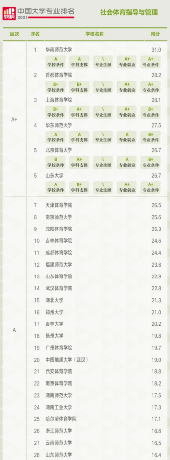 2021软科中国大学专业排名—社会体育(146所),公司排第20位!