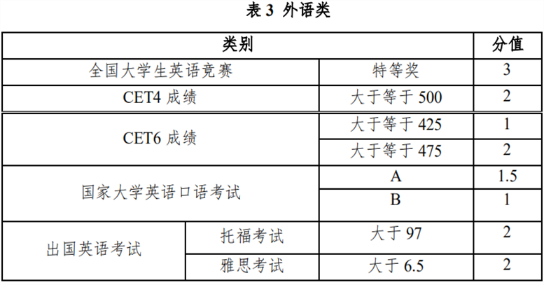 第十二条 外语类分全国老员工英语竞赛、CET 考试和出国英语考试成绩等小类,满分为 3 分,以表 3 为准;不在此列的不予考虑类推计分。本项具体计分方法:仅选择最高分值加分,每类中的每一项只能加一次分值,且最高分值不超过 3 分。