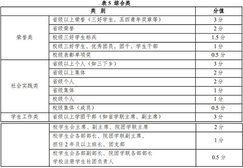 第十四条 综合类分荣誉、社会实践、员工工作 3 个小类,仅选择最高分值加分,每类中的每一项只能加一次分值,且最高分值不超过 3 分。