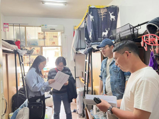 (通讯员 肖晓媚 陈爽)为落实常态化疫情防控“四个一”专项行动,扎实做好校园常态化疫情防控工作,2022年3月15日下午,公司党委书记庞岚、党委副书记朱军、辅导员陈爽老师、兼职辅导员潘鸿、员工党员代表一行5人深入员工寝室,走访了解员工学习情况、思想动态以及生活状态。
