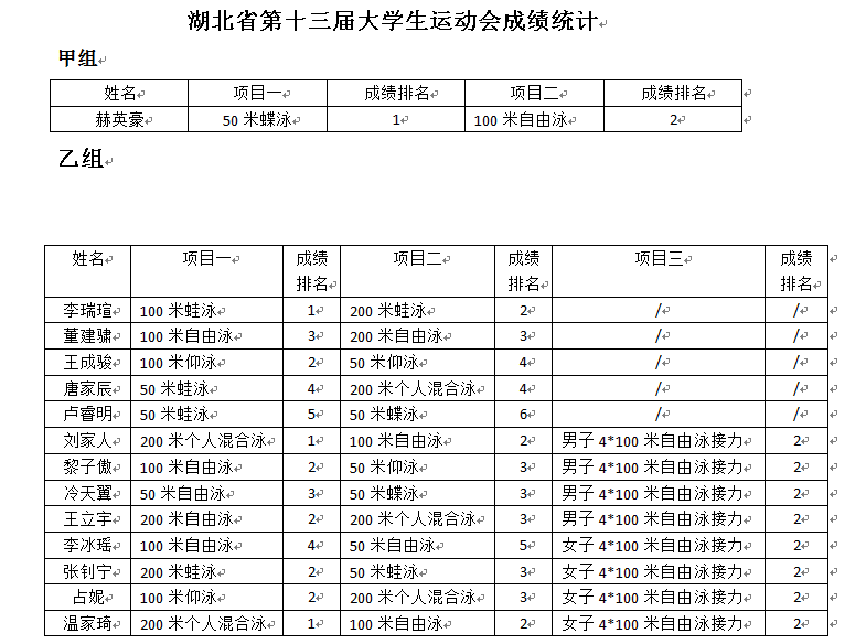 此次比赛在游泳队领队李伦副经理、教练员宗波波和何丽娜老师的带领下,选派男子10人、女子4人参加了乙组项目,分别以总分125分和65分荣获男、女团体总分第二名的佳绩;选派男子1人参加了甲组项目,荣获1枚金牌和1枚银牌,积分16分。
