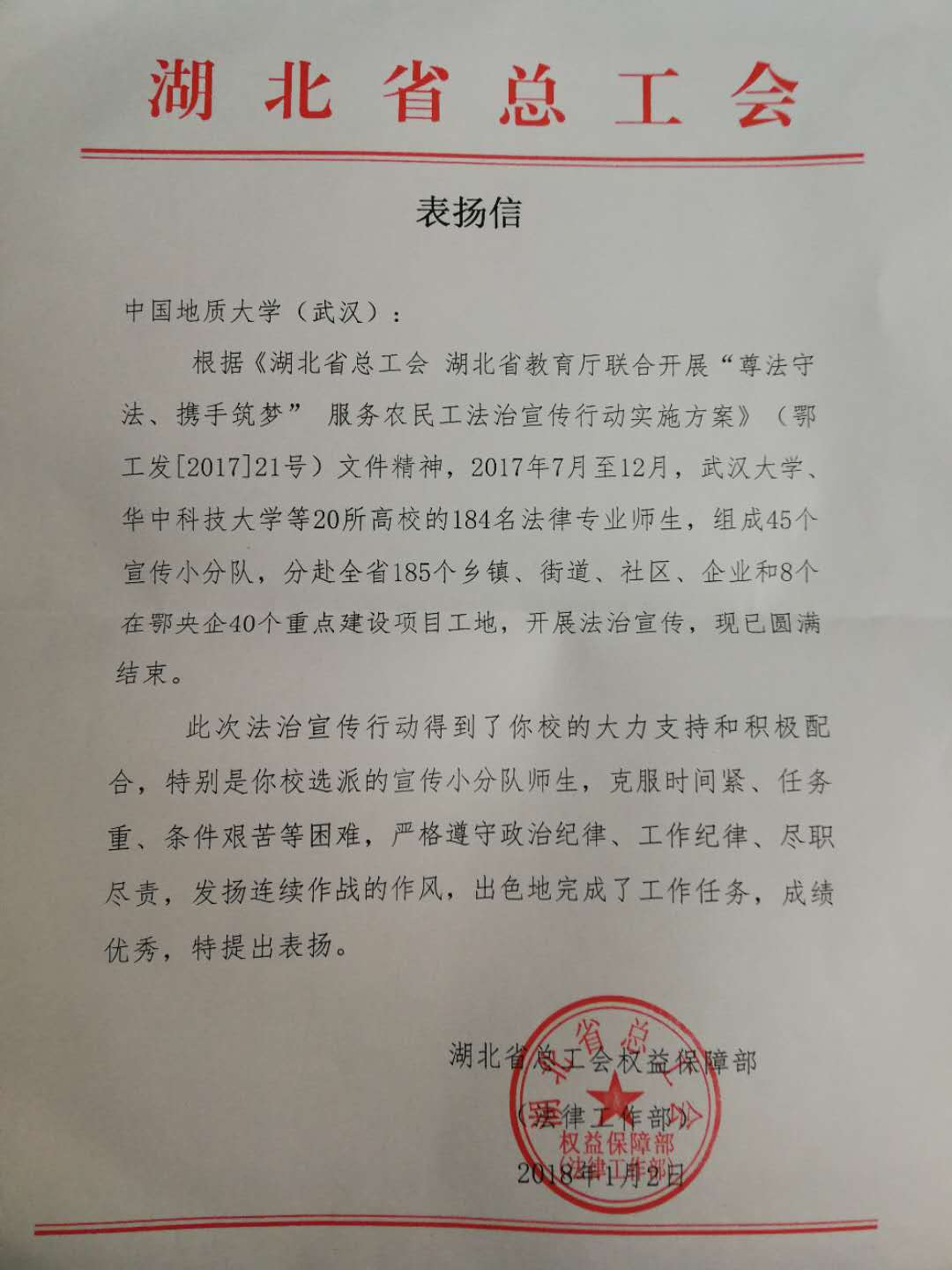 近日,鉴于公司选派的小分队在省总工会和省教育厅联合举办的“尊法守法•携手筑梦”服务农民工法治宣传活动中,克服时间紧、任务重、条件艰苦等困难,严格遵守政治纪律、工作纪律、尽职尽责,作风优良,出色的完成了工作任务,成绩优秀,湖北省总工会特来信予以表扬。